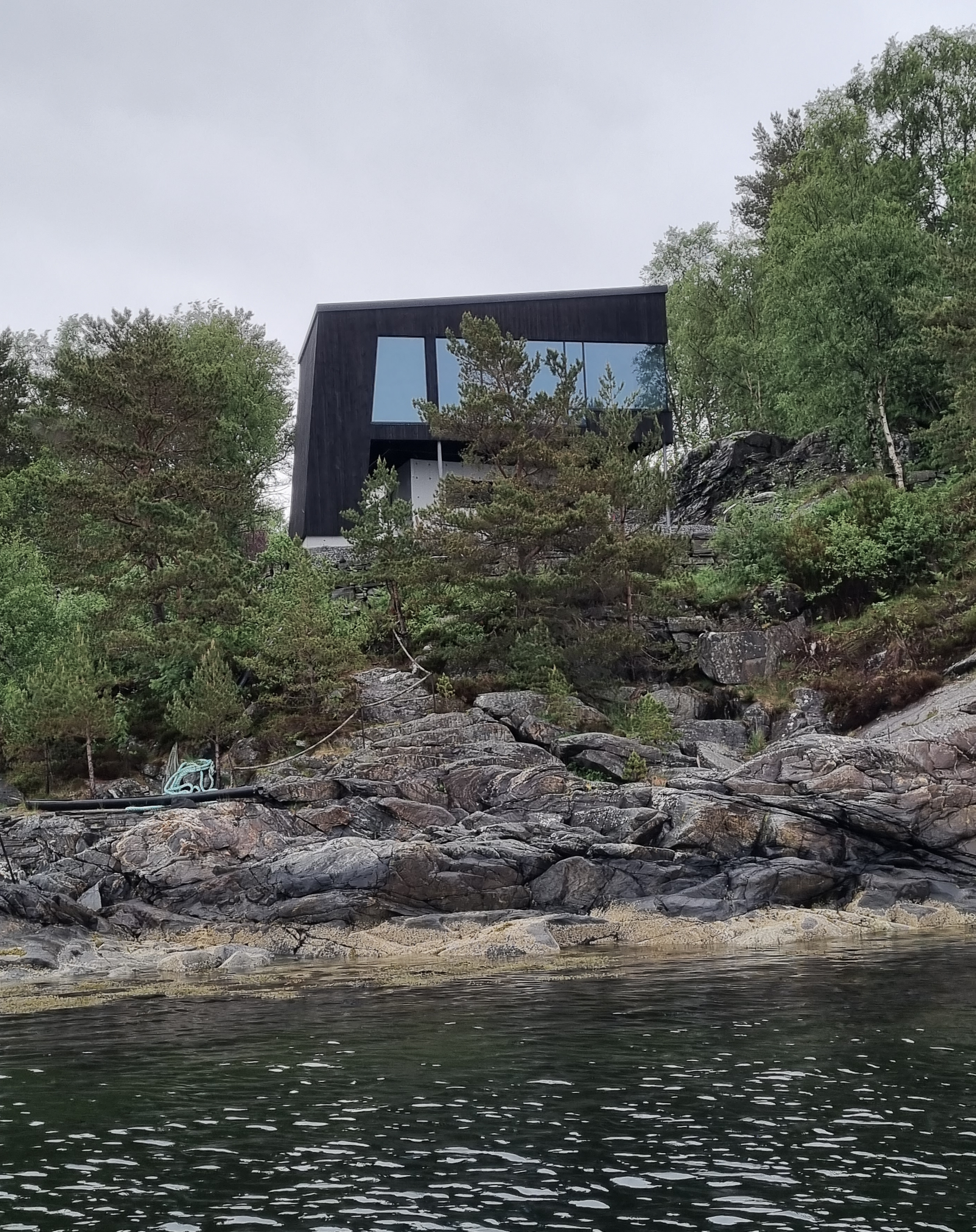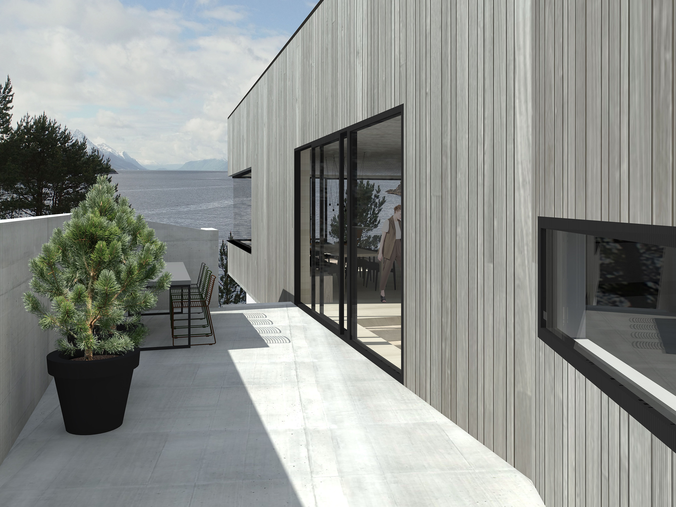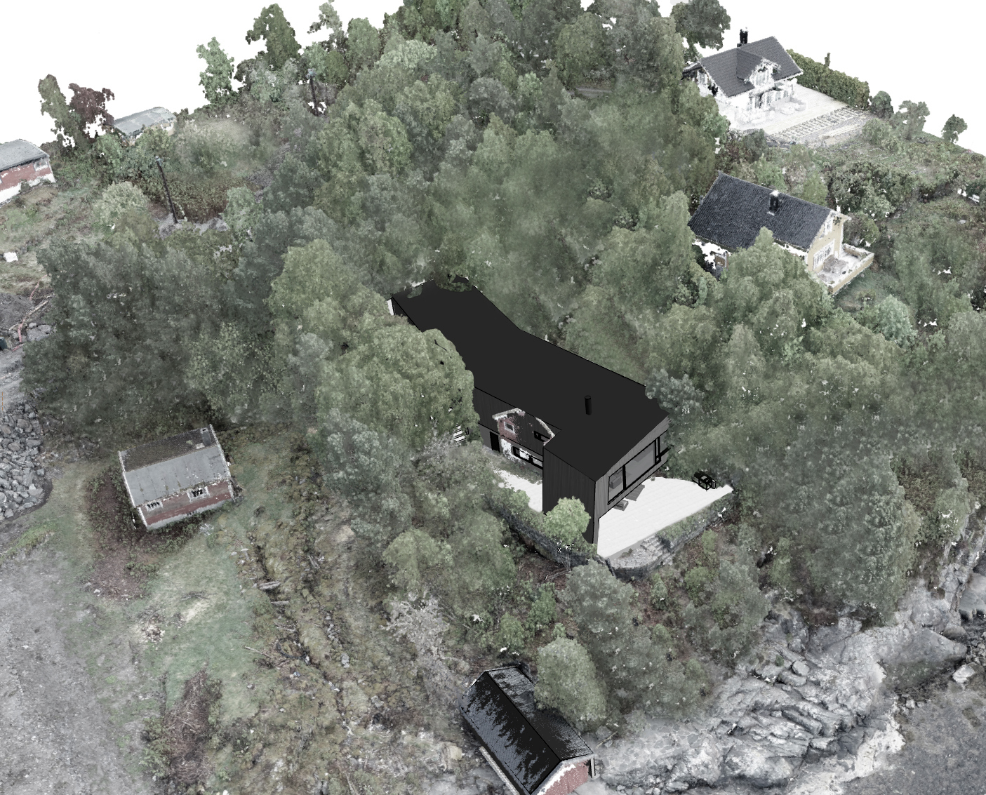 Her ønsket kunden at vi skulle tegne et hus som passet inn i terrenget uten å gjøre for store inngrep i terrenget rundt. For best mulig tilpasning ble det benyttet 3D skanning av tomten. Huset er tilpasset tomten og vil gi en skjermet følelse selv om det ikke ligger helt alene. Man vil her få en naturtomt med busker og trær helt inn på seg samtidig som bygget åpner seg ut mot havet.