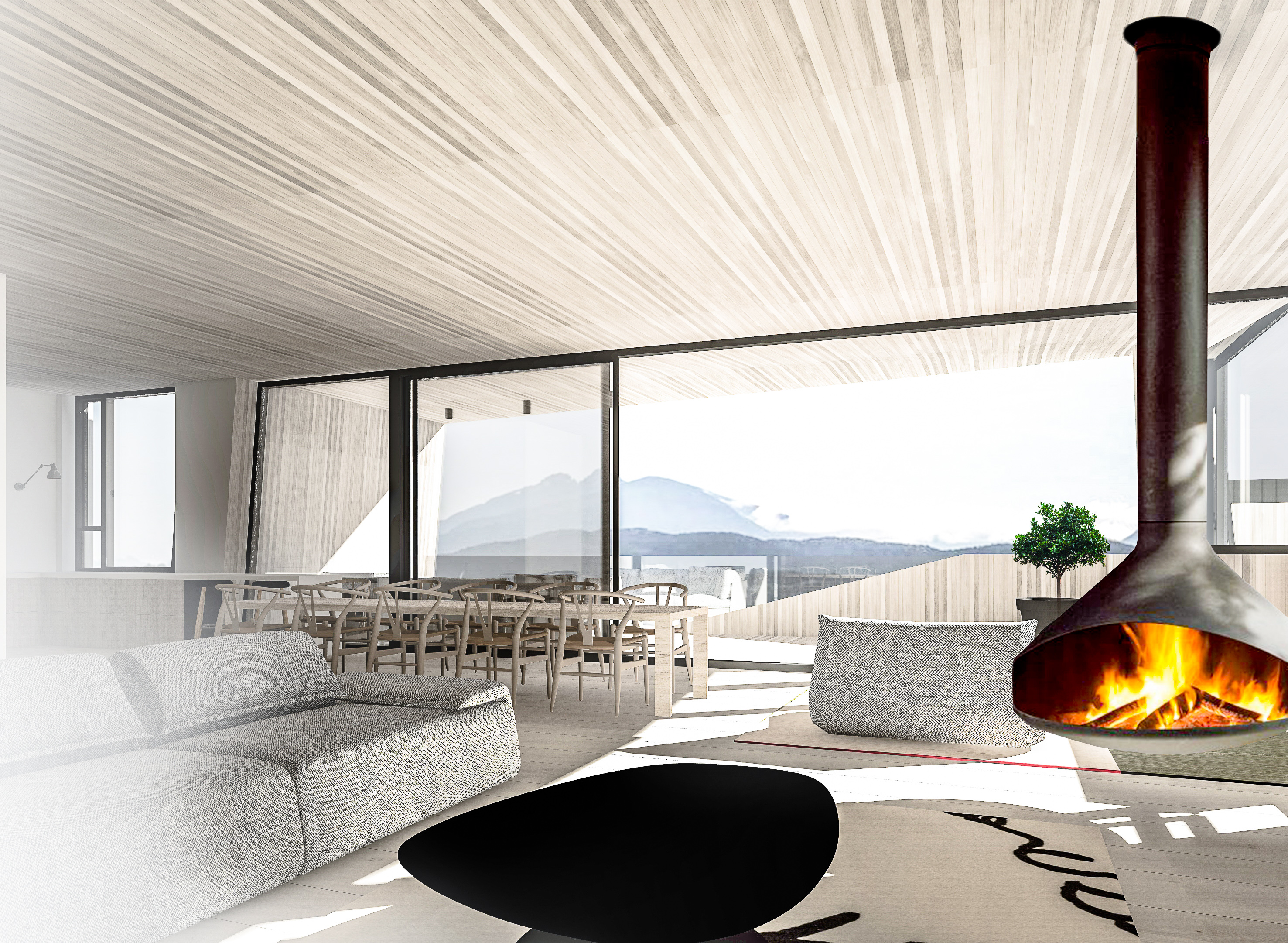 Dette huset får en spenstig saltakskonstruksjon som muliggjør en flott uteplass med utsikt rett ut mot fjorden.